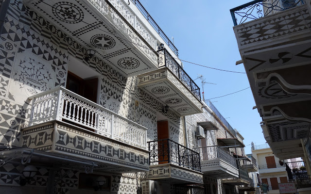 , Pyrgi est célèbre pour ses façades recouvertes de motifs décoratifs gris et blancs appelés